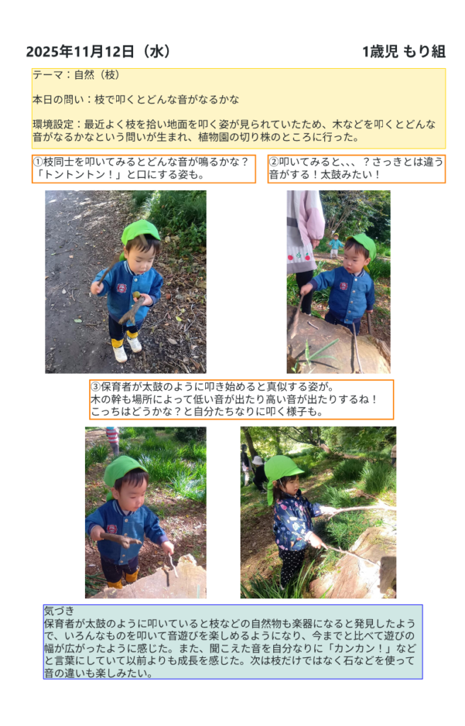 【自然(枝)】(もり)枝で叩くとどんな音がなるかな
