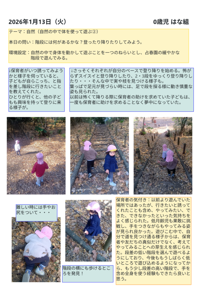 【自然(自然の中で体を使って遊ぶ②)】(はな)階段には何があるかな?登ったり降りたりしてみよう。
