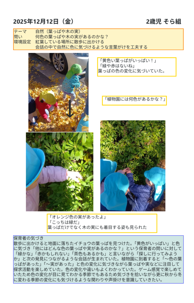【自然(葉っぱや木の実)】(そら)何色の葉っぱや木の実があるのかな?